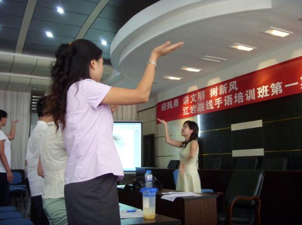 2008年9月6日是北京残奥会开幕的日子,为了营造全民参与残奥会,支持残奥会和关心残疾人的社会氛围,华岩手语培训班联合重庆红岩历史博物馆举行了手语培训,为红岩历史博物馆的工作人员和来自社会各界的60多名学员讲解聋人手语,此次手语培训的目的就是为了聋人平等参与社会提供无障碍的社会环境,让我们更容易接纳聋人,让聋人感受到社会大家庭的温暖!此次培训的内容有手语基础知识,手语基础词汇,手语翻译等,共计学习30课时!
