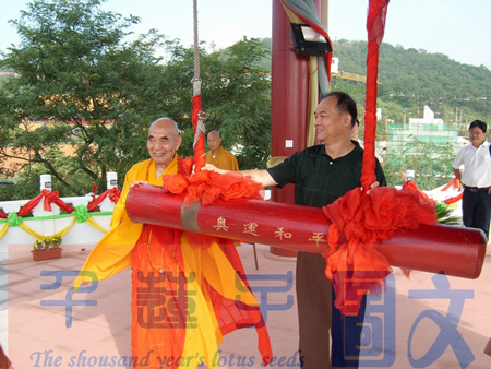 2008年9月17日上午,国家宗教事务局副局长齐晓飞一行三人在山东青岛市宗教事务局副局长魏文选陪同下到青岛湛山寺参观指导,受到山东佛教协会会长、湛山寺方丈明哲长老的热情接待。适逢湛山寺举办传授三坛大戒法会,齐晓飞一行在明哲长老,和应邀参加法会的台湾中国佛教会理事长净良长老的陪同下,先后参观了湛山戒坛、卧佛殿,并登上塔园钟台撞响奥运和平钟,祈愿世界和平,国泰民安。