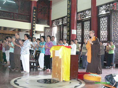 首先法师引磬、香赞 引领大众唱诵心经 礼拜释迦牟尼佛,唱诵开经偈。