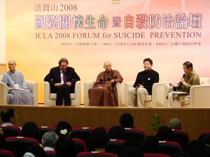 有鉴于国际公民社会已将自杀防治列为当今世界的重大课题,有需大家携手合作,相互交换经验和信息。9月7日上午九点在台大医院国际会议中心401室,由法鼓山人文社会基金会与自杀防治中心合办『法鼓山2008国际关怀生命暨自杀防治论坛』活动。会中邀请法鼓山创办人圣严法师与世界防治自杀协会主席Professor Brian Mishara博士进行对谈,并邀请自杀防治中心执行长江弘基及法鼓山副住持果晖法师等贵宾做专题发表,而内政部廖了以部长也亲自莅临与会。