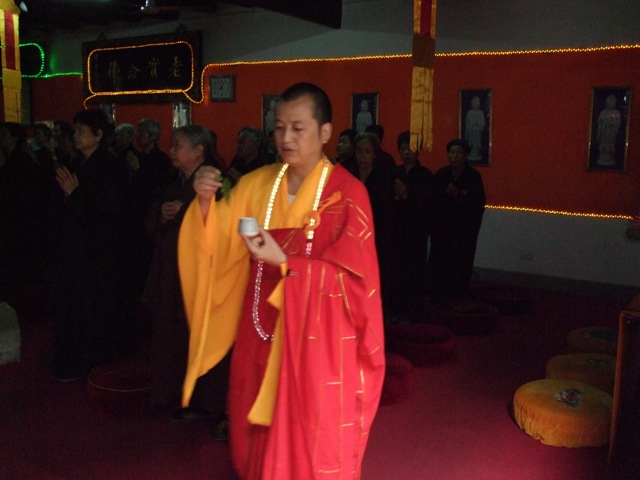 继承祖业,提倡禅净双修的道坚法师在开坛洒净,揭开了168小时精进念佛的序幕