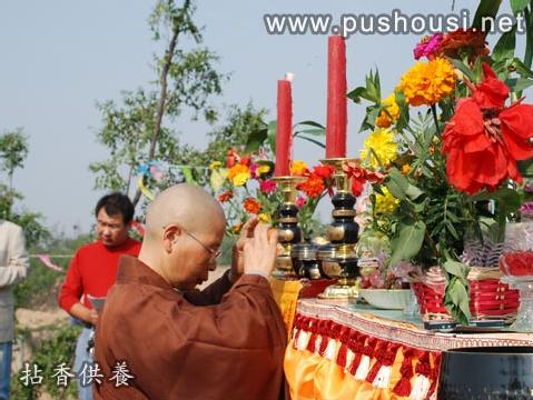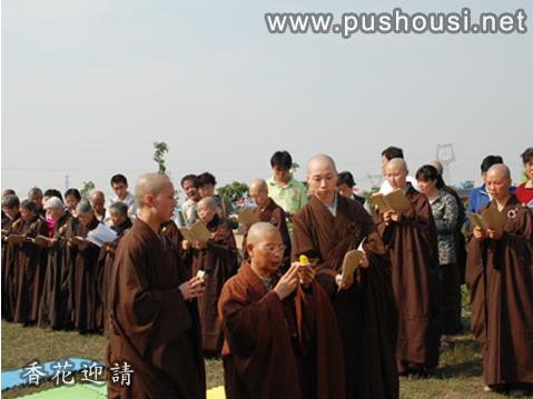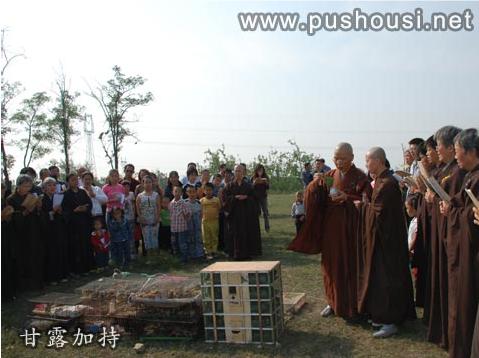 师父在百忙之中下山来主持法会,并对前来参加的居士们开示,放生的目的和意义,为所有生灵受皈、开示及代其忏悔。并为所有被放的生灵取法名为:善生。希望他们都能投生善处,永离诸苦。放生后,还为北胡村的六十五岁以上的老人发了面粉和月饼以示中秋的慰问。