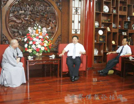 叶小文会长首先对果东法师一行表示了热烈欢迎。他说,果东法师作为法鼓山第二任方丈,首次率团来大陆参访,意义重大,可谓掀开了法鼓山与大陆佛教界的交流新篇章,必将对继续深化两岸佛教交流产生积极影响。叶小文会长历述与圣严长老(果东法师的师父)的几次见面,回顾此访的因缘。叶小文会长说,圣严长老一直大力支持世界佛教论坛的举办,并特意发来信函提供热诚的指导建议,他对此深表谢意。