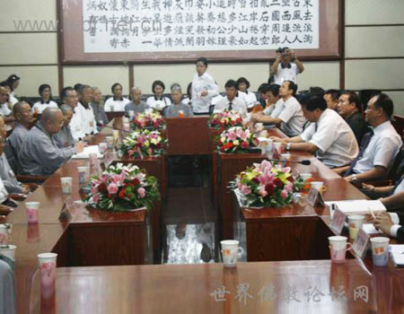 法鼓山方丈果东法师对叶小文会长的热烈欢迎表示了诚挚的谢意,他追忆了2002年随圣严法师来大陆护送山东四门塔失散“佛首”时的情景,并介绍了法鼓山在汶川地震中的救灾工作。他表示,法鼓山会积极参与第二届世界佛教论坛,与大陆佛教界共襄盛举,并希望明年在京举办“2009年汉传佛教国际研讨会”,继续推动两岸佛教界的友好交流,深化第二届世界佛教论坛宗旨。此建议立即得到叶小文会长的高度肯定,并表示将积极提供帮助。