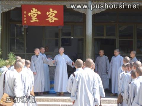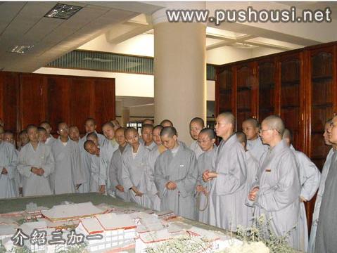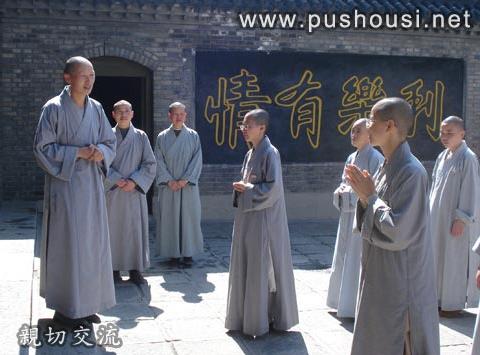 2008年9月20日上午10点,普陀山佛学院参访团一行抵达普寿寺。她们是凌晨四点从普寿寺的下院大乘寺出发的,迎着喷溥而出的朝阳,踏着欢快的脚步,朝圣的渴望让她们忘却了山中的低气温,忘却了身边走过的凉风,她们的到来受到我寺当家师、知客师和大众师父的热情接待。
