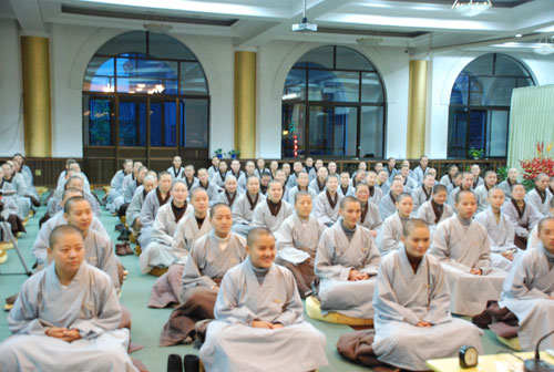 2008年9月20日普陀山佛学院参访团抵达普寿寺后,学僧们不顾长途跋涉的辛劳,把尘埃和不适都抛在放下的行囊里。对法的渴求使她们连续几天来,一直随常住师父们一起上殿、诵经、听课学习。所观、所学皆深有体会。