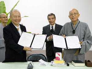率领日本立正大学海外参学交流团的领队三友健容教授,曾是法鼓山创办人圣严法师旅日时的故交好友。这次他带领立正大学佛学系学士部及研究所师生共47位团员前来台湾进行地域佛教研究及参访活动,并造访高雄佛光山及台南地区众多寺庙。7日三友健容教授率团参访法鼓山,由圣严法师在北投农禅寺设斋款待远来嘉宾。稍早之前法鼓研修学院曾与立正大学缔结姊妹校情谊,因为法鼓研修学院改名为法鼓佛教学院,因此藉由此次参访的机会,举行法鼓佛教学院与日本立正大学两校缔结姊妹校的换约仪式,并由圣严法师与三友健容教授代表换约,象征两校继续保持友好的情谊与互助交流的关系。