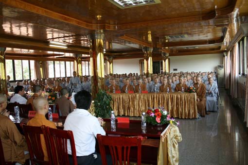 最后,中国佛教协会副会长兼秘书长、福建省佛教协会会长、福建佛学院院长学诚法师发表语重心长的讲话。他说应先建立生命宗旨,要有责任感、使命感,要树立远大目标,坚定信仰,珍惜因缘,丰富知识结构,发大菩提心,以戒为师,刻苦修学,在有限的时间内认真学好学院规定的各门课程,努力把自己铸造成新时代的合格僧才。