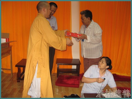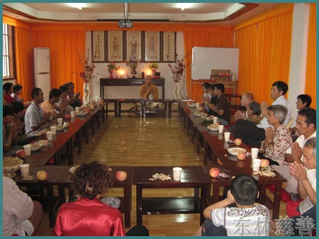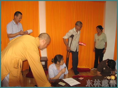 念佛改变命运的张洪则给我们简单介绍了自己得白血病和系统性红斑狼疮后是如何学佛,把生命依托给佛菩萨,对阿弥陀佛深信切愿白天晚上梦里念佛不断的心态及一次偶然的因缘在菜市场看到掉地上的螺丝怕它被踩死突发慈悲心捡起来放生后,十几年每天坚持走大约20里路跑遍九江各大菜场捡掉在地上的鱼、虾、螺丝等动物放生的学佛经历,最后治愈白血病和系统性红斑狼疮这两种疑难杂症转变命运的过程。同时也承诺自己未来将在东林慈善功德会这个平台与大众广结善缘,弘扬佛法,奉献自己。长期在东林慈善门诊部享受免费医疗服务的蔡菊花、宗娟等人对东林慈善门诊的免费医疗服务非常感恩,因为东林慈善门诊这个医疗机构,为她们解决了人生的第一大苦,病苦。而东林慈善功德会给予她们的居家关怀,心灵关怀,又给了他们生活的勇气和站起来的力量。蔡菊花在会上说因为有东林慈善功德会的心灵关怀,有慈善门诊的免费医疗,佛菩萨的加持,自己的内心充满了法喜。这次女儿中考,超常发挥,上了重点高中的重点班,很感恩功德会改变了他们全家的精神面貌,带给她们家新的憧憬和希望;宗娟则说到自己的这条命是慈善功德会的人给的。去年雪灾,老两口生病又无钱医治,正在家里揭不开锅一筹莫展时,功德会的工作人员如神仙般地出现在她们面前,给她们家送去了过冬的棉衣棉被,还给她们办了免费医疗证。今年夏天三伏天时的高温使她中暑在家,正在她觉得自己生命将近,决定往生时,东林慈善人出现在她家并带她前往慈善门诊部治疗,门诊部工作人员了解到她家连台风扇都没有时,非常关心老人的生活,立即从家里拿了一台风扇送给宗娟老人。……会场气氛热烈,大家来到东林慈善功德会,就像回到了自己家一样欢喜自在。镜义法师也趁这个中秋佳节之际,对这些生活因各种原因导致困难的兄弟姐妹们作了开示,告诉大家今生贫困多病的三世因果道理,并以人活着是为什么这样的问题启迪大家思考人生的真谛。并以念佛感应现代版的张洪的例子告诉大家把身体放下,把贪嗔痴慢疑放下,一心念佛、放生、行善、心静下来了,身体也就自然康复了,鼓励大家精进念佛,存好心,说好话,做好事,一定会改变命运,张洪的改变就是个活生生的例子,大家在生活中应以张洪这个善知识为例,勇猛精进,活在当下。并祝大家中秋佳节团团圆圆,六时吉祥。