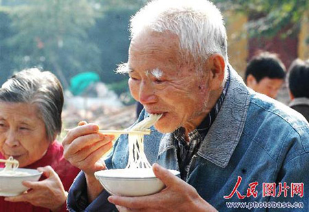老人津津有味地吃着长寿面