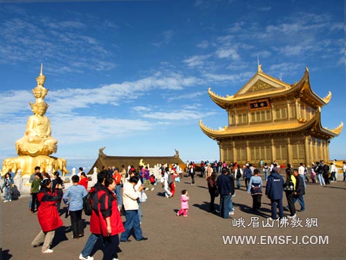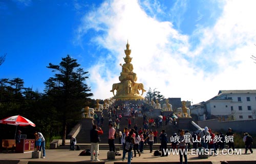 金顶又称“光明之顶”、“幸福之顶”代表着普贤菩萨无边的行愿。是广大居士信众心中的圣地,也是峨眉山佛教协会提出的建设普贤道场“三个中心”的理念之一,即把以金顶华藏寺为代表的高段山区作为峨眉山佛教的“朝圣中心”、把以万年寺为代表的中段山区作为峨眉山佛教的“修持中心”、把即将于12月14日(农历冬月十七)举行开光大典的大佛禅院为代表的低段山区作为峨眉山佛教的“文化、教育中心”。