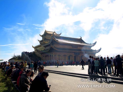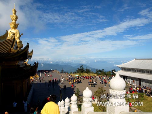 今天金顶的天气格外晴朗,艳阳高照、万里无云,处处人头攒动。"千座名山一座顶" ,金顶海拔3097米,是峨眉山主峰. 登临金顶,人们顿觉万象排空,气势磅礴。极目四望,成都平原尽收眼底。千山万岭,起伏如浪,岷江、青衣江、大渡河、瓦屋山、贡嗄山历历在目。故古人登临金顶,赞曰:“黄鹤高飞过欲迷,人间山岳莫能齐。才收云海乾坤小,独立天心日月低!”