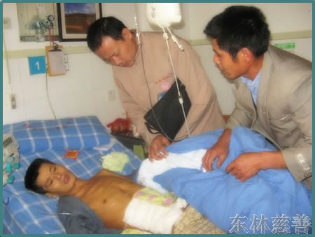 病人张地久平躺在床上,正在输着脂肪乳和液体,嘴唇上伤痕累累。同房的蔡先生一见到我们了解到我们是东林寺慈善功德会的工作人员,立即在病床上对我们双手合十,感谢我们,希望我们能够伸出援助之手帮助同病房苦难的张地久。同病房的张先生也对我们说,他们与张地久素不相识,可当他们目睹张地久的溃烂的身体,邹索琼到处求人,无可奈何,最后在街上乞讨为救丈夫时,他们都纷纷解囊,出钱出力资助他们。