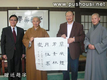 牛茂森一行向如瑞法师赠送一幅具有禅意的题字:“兰风体芳素,林月性高空”。如瑞法师赠送客人《吉祥经》、文殊菩萨像及六道木念珠。