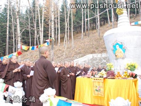 另一部分学僧则走出山门,前往塔院寺去随喜普佛法会。浓浓的道情和法益让佛子们多了几许默契与坦然。最令人感到不可思议的,却是普寿寺法堂里发生的一切。师父在这特殊的日子里,慈悲的为来寺参加法会求皈依的居士授皈依,并在皈依后作了深切的开示。在师父谆谆教诲时,法堂外飞来了一群喜鹊,喜鹊欢快的鸣叫让人不由得联想纷纷。此时的五台已进入了初冬,是哪里的喜鹊迎着寒风在欢唱呢?人们不约而同的想到了观世音菩萨。也许这是菩萨在示现世间的祥和、清静与美好吧!