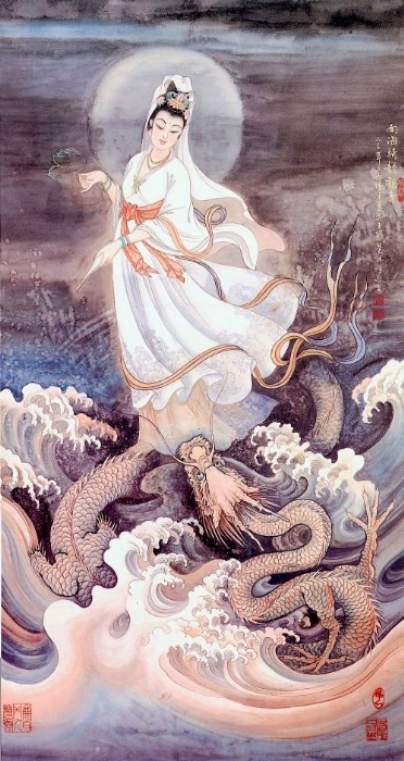 四、南海大士、南海菩萨、补陀大士、慈航大士、守护神∶ 自古以来,信仰中以为观世音菩萨居住於「南海补陀洛迦」山上,故名「南海大士」、「南海菩萨」或「补陀大士」;又依据古经典观世音菩萨常常从补陀洛迦山上往南海下看,救援海上危难,此海上危难乃人生之譬喻,因此因缘,故称「慈航大士」,又航海者及渔夫归仰之,咸尊崇其为海上的「守护神」。(注∶补陀通普陀)