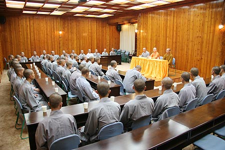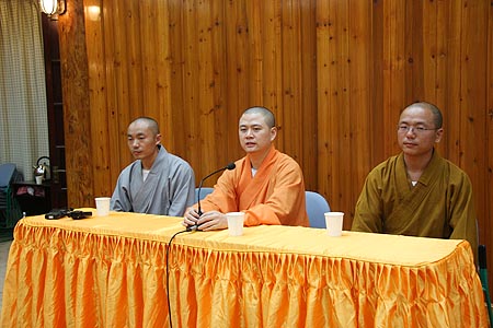2008年9月19日晚,普陀山佛学院预科班师生一行51人,结束太姥山平兴寺的参学活动后,在监学宽度法师的带领下参访浙江宁波七塔禅寺,受到七塔禅寺方丈可祥法师、监院定昌法师的热情接待。可祥法师在七塔禅寺玉佛阁为同学们作慈悲开示。