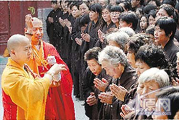 昨日奠基的“祖林”根据“青龙山慈云寺五十三峰圣境图碑”所标位置重建,位于慈云寺山门东南约200米处,占地面积40亩,建筑面积1200平方米,建设期两年,总投资预算为1500万元,为新加坡国际金融集团、香港国际金融集团、兴亚集团控股有限公司董事局主席程道兴捐资修建。 图为慈云寺开光仪式。