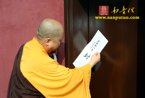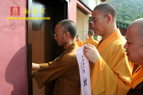 2008年10月12日,厦门顶释寺住持果利法师闭关仪式在南普陀寺闭关房举行。封关仪式由我寺方丈则悟大和尚主法,南普陀寺常住僧众和果利法师的诸多信众参加了这一简短而庄重的闭关仪式。在声声梵唱中,法师缓缓走进关房,并回首礼谢大众,三拜封门,正式开始闭关修行。