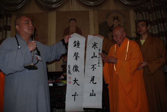 果东法师介绍了圣严法师在台湾佛法情况,随后代表法鼓山向寒山寺赠送了挂屏《人间净土》和圣严法师的书法集、画集和亲笔书写的对联“寒山不见山,钟声彻大千”,并邀请寒山寺方丈秋爽去台湾法鼓山共叙法缘。