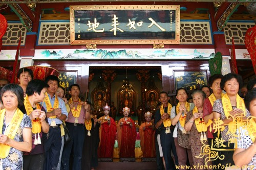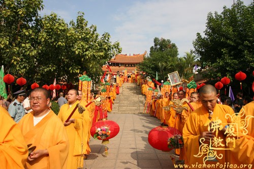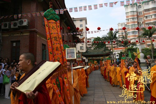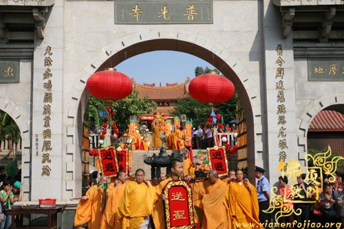 下午2时许,大众云集大雄宝殿,仪仗队手举提炉、花蓝、灯笼、宝盖迎请内坛主法圣修长老、普光寺监院道祥法师等五位法师主持送圣仪式,僧众、善信、香客、游客上千人参加了送圣仪式。