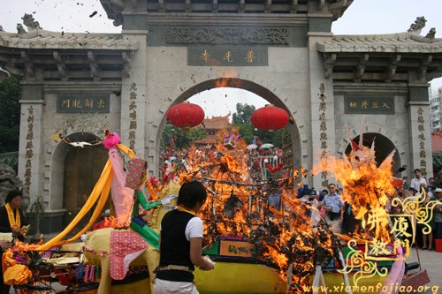 送圣队伍缓缓绕行水陆道场一周。至山门外众法师再次如仪诵经,引火焚化圣船,彩纸扎制的大船承载着众人的期望,融众生苦恼于智慧火海,导六道亡灵往生极乐。留下的是众信无尽的祝福与深切的悲愿:现生者身心康泰,过去者往生极乐。