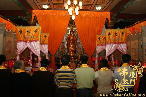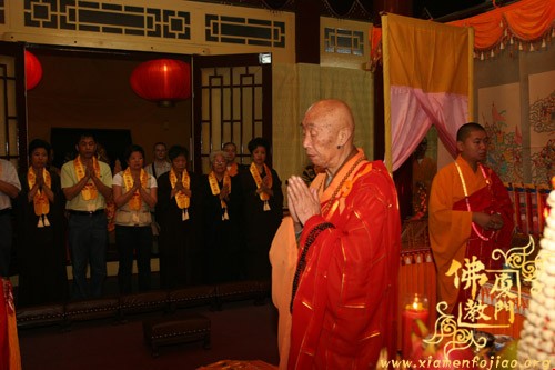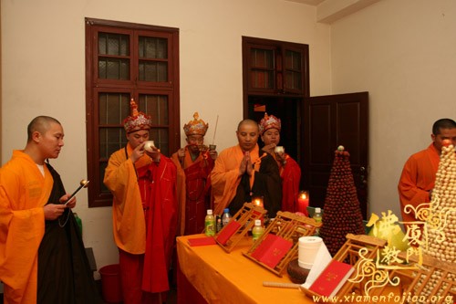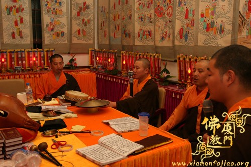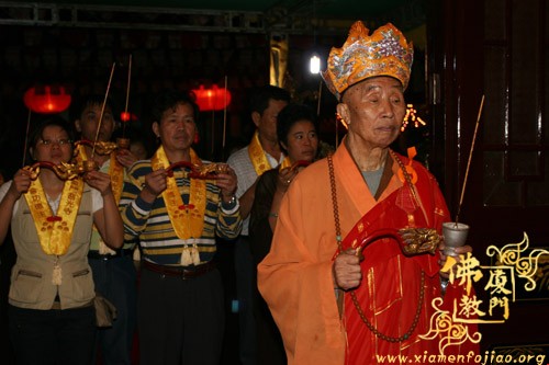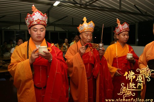 今天凌晨2点30分厦门普光寺水陆法会第三天内坛开始结界洒净,恭请诸佛、菩萨等圣众光临坛场。此次内坛由浙江金华佛教协会会长、江西上饶护国寺圣修长老主法。常仁法师为正表,灵光法师为助表。内坛斋主虔诚设拜如法如律。