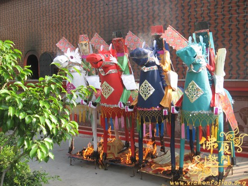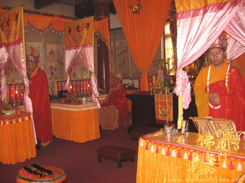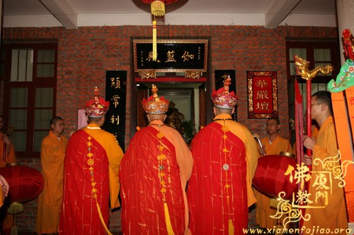 上午8点发符悬幡,由四大内修菩萨行,外现神王身的使者手持符牒、疏文,往天、空、地、冥去召请圣众神灵后,升扬写着〔启建十方法界四圣六凡水陆普度大斋胜会道场功德〕的宝幡。普告三界,广召圣凡亲临法会。
