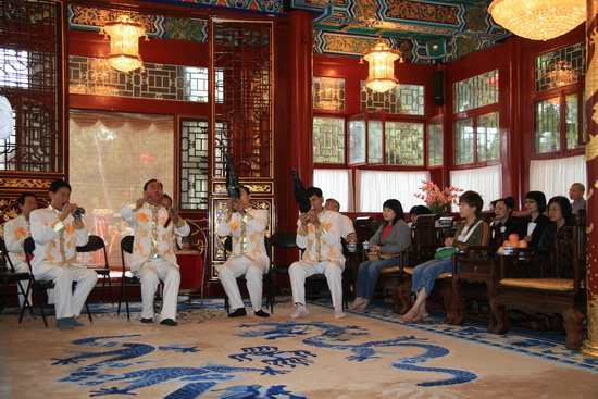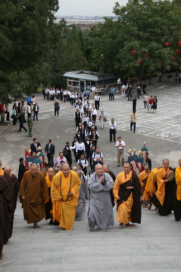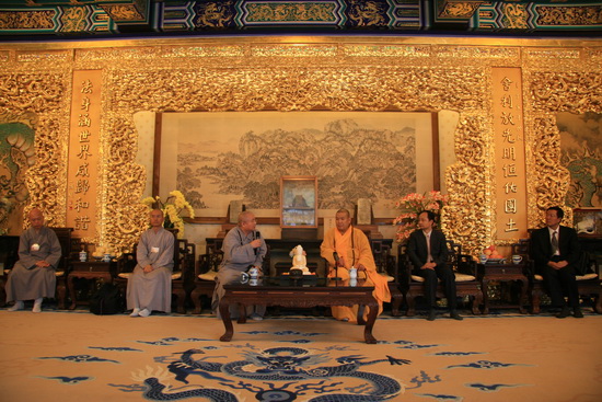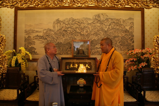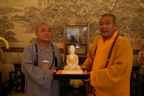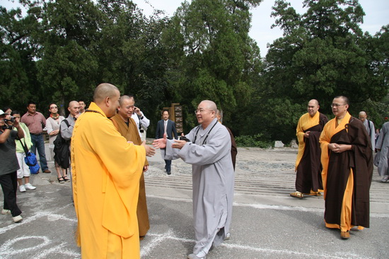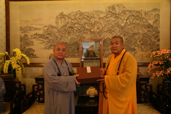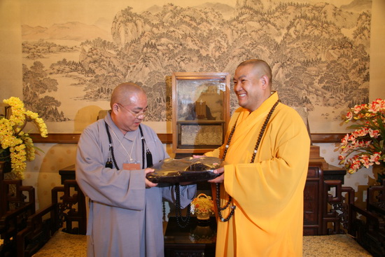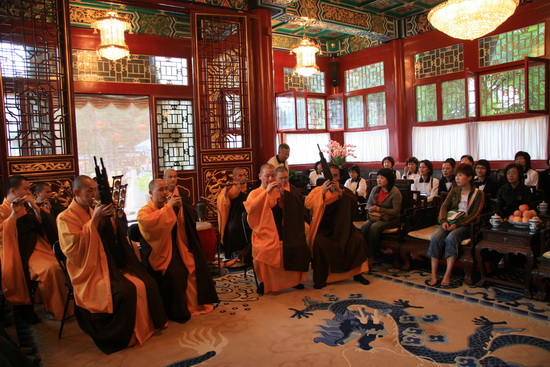 法鼓山圣迹巡礼团一行首先进入佛牙舍利塔膜拜;随后,宾主双方在迎客厅里欢叙交流。灵光寺佛乐团为巡礼团奉献了精彩的欢迎表演,常藏法师代表灵光寺常住向圣严法师及果东法师分别赠送了精美礼品,并安排巡礼团参观灵光寺各处设施。