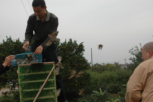放生仪式结束后,为使所放之众永免网捕之祸,本着恭敬众生的原则,由法师带领,在弥陀名号的加持声中,由一批信众将鸟类放归山林,另一批信众乘船将鱼、贝、螺类等水族放归太湖深处。