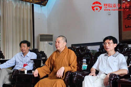 当天下午四点,南华禅寺游人已经纷纷离去,寺院也慢慢的恢复了平静,这时考察团的车悄然来到,在南华禅寺方丈传正大和尚的陪同下,考察团沿着寺院中轴线进行参观,曹溪门、宝林门,大雄宝殿、藏经阁、祖殿、卓锡泉等景点以及景点背后的故事引起了考察团的极大兴趣;特别是当导游向考察团介绍《六祖坛经》是佛教史上唯一一部中国人写的佛经的时候,大家都表示惊叹,纷纷表示希望有机会能够拜读这部巨作。最后,常委们在方丈室举行了会谈,对南华禅寺未来建设提出了宝贵建议,而南华禅寺也给每位常委赠送了一本《六祖坛经》,以作留念。傍晚五点左右常委们离开南华禅寺。