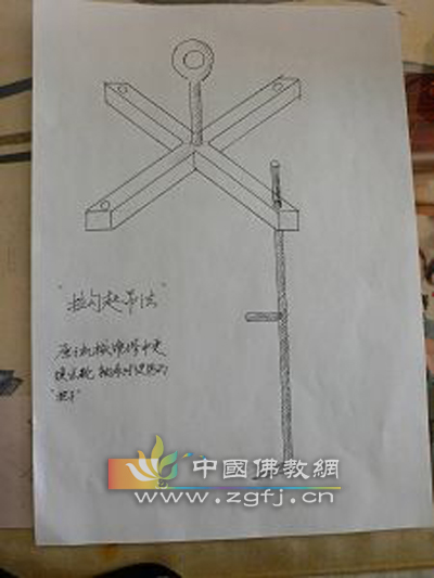 据黄乃海介绍,具体的步骤分五步进行。第一步:先把提前做好的四根吊钩顺铁函内壁慢慢放入,吊钩的长度要超过铁函高度,吊钩的形状为上部大而粗,下部小而细,这样才能保证既有力度而又稳妥地插入缝隙,钩尖部还要套上皮圈,以免伤及丝织物和塔身。特别之处是一定要把吊钩的钩端做成大于90度的尖角型,才能顺利找到缝隙进入塔底部。第二步:在铁钩杆子中部还要焊接一个约10厘米的转动把柄,与吊钩钩尖成20度错位,考古专家转动把柄,铁钩就插入塔王四个角的底部。并且保证四根铁钩在同一个水平线上。第三步:测量吊钩的边长,再制作一个铁箍,根据吊钩的定位,确定铁箍的形状,用绳子送入铁函底部,将吊钩紧紧地箍在塔王底部侧面,防止铁钩向外移位,确保不会滑落。第四步:把预先制作好的十字形支架与四根吊钩结合。先将四根吊钩的顶端插入十字架打好的孔里,再从旁边用螺栓锁住。第五步:最后由滑轮架慢慢起吊,请出阿育王塔。