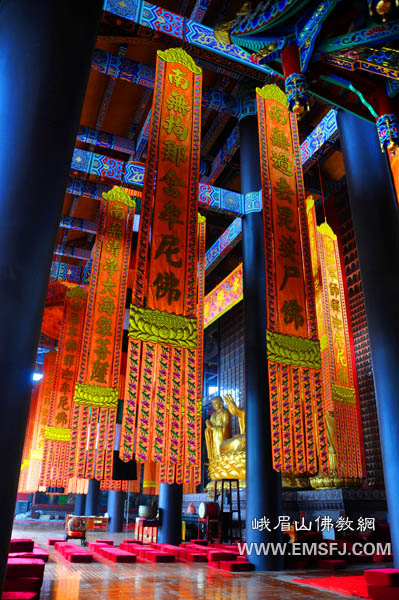 评语:大殿雄伟宽阔,佛像庄严肃穆,海众云集,颂佛祝祷。该图采用超广角拍摄,使画面更具视觉效果,展示了圣殿的庄严与宏大,体现了峨眉山众僧对佛教文化的传承与发扬。