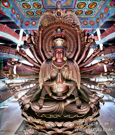 评语:观世音菩萨,现千手千眼,以慈悲心寻声救苦,普渡众生。大佛禅院观音殿中供奉的是世界上最独特的四面千手千眼观世音菩萨。塑像通高15.6米,以500多方乌木精雕而成,并饰以花金彩绘,造像慈悲安祥、庄严伟岸,与乌木之厚重沉着、灵性神秘珠联璧合、相得益彰,令人叹为观止。该图用广角镜头将其完整拍摄,用光讲究使其更有立体感 。