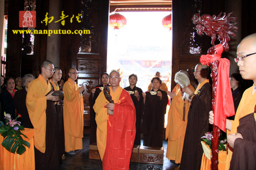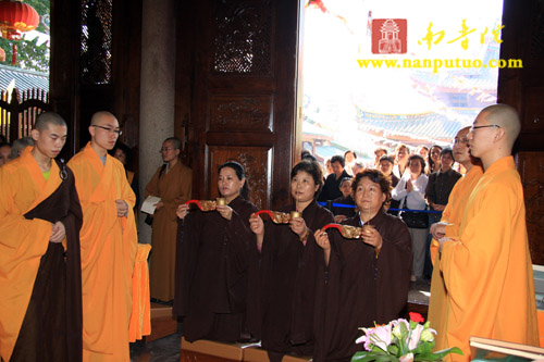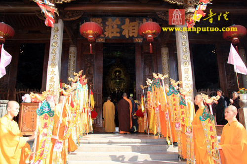 今日有北京市崇文区朱汉光合家、郑银奶合家,施国光、黄彩微合家,翁克乐、高意合家发广大心,请法斋僧,大作佛事,恭设上堂大斋一堂供佛及僧。上午10时,威仪庠序的仪仗队至方丈楼迎请我寺首座了法法师移步大坛上堂说法,法师慈悲应请,为大众及诸斋主宣示拈花微笑、不二法门之微妙深理,植众福田、种诸善根。