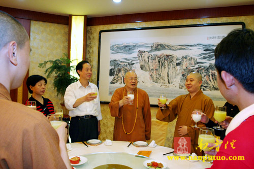 中午12时30分,我寺在普照楼设宴,南普陀寺法主、闽院院长圣辉大和尚,南普陀寺方丈则悟大和尚,监院界象法师等一同与来宾共进午餐。席间,宾主双方亲切交谈,乡情浓浓。两位大和尚更是向来宾一一敬杯,以示欢迎。大约一小时之后,午宴在大家的欢声笑语、相互祝福中结束。