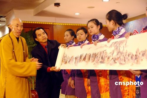 11月28日晚,来福州参加“纪念义存祖师圆寂一千一百周年暨禅宗思想学术研讨会”系列活动的著名画家陈良敏先生(左二),向福建省佛教协会副会长、福建雪峰崇圣禅寺方丈释广霖法师(左一)交送其力作、十二米画卷《五百罗汉》。