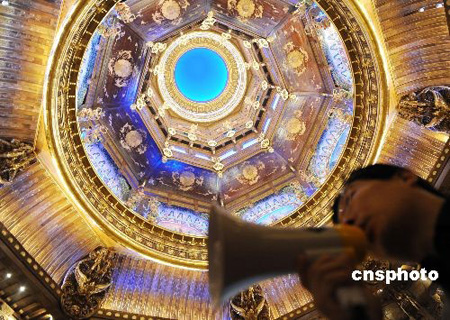剧场上方,是高度达30米的巨大穹顶,干余盏金光灿灿的莲花灯瞬间开启,刹那间千万盏明灯拱聚的圣坛,仿佛星光灿烂的苍穹。