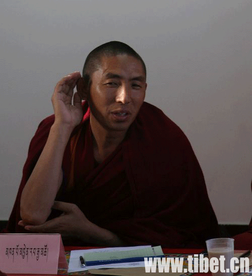 考评人员堪布钦饶坚措“竖”着耳朵听辩经