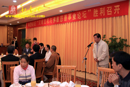 林致知副厅长在宴会上说了三句话:一、欢迎各位领导法师学者来福建厦门参加论坛。二、感谢各位长期以来在慈善事业方面为人民、为社会、为国家作出的杰出贡献。三、祝福本次论坛圆满成功。席间,领导们向各位嘉宾一一举杯问候,并亲切招呼大家用心品尝普照楼声名远播的精美素菜。