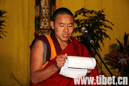 西藏昌都地区江达县古普寺吉美朗加代表获得高级学衔的僧人发言