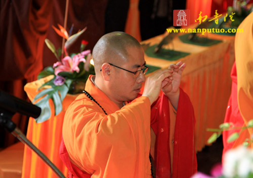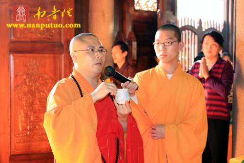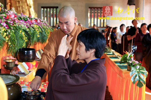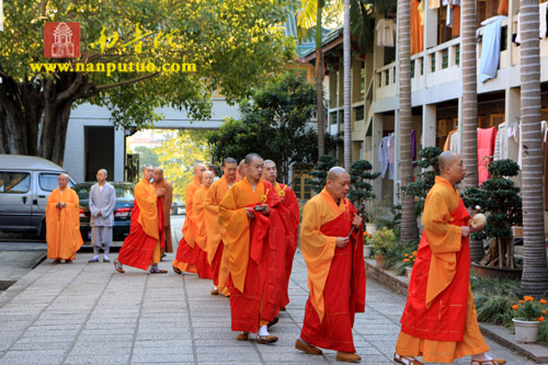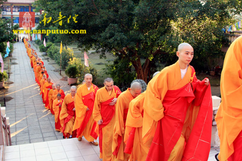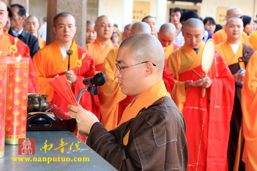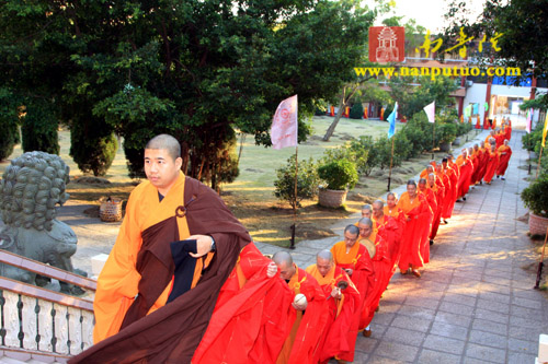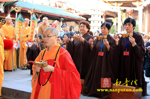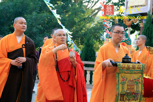 受南普陀寺方丈则悟大和尚委托,法会熏坛仪式由本寺监院界象法师主法。11月11日下午3时30分,界象法师在持幡执炉、庄严有序的仪仗队及会主代表的迎请下步入大坛,随之炉香赞起,梵音称扬。之后,法师手持杨枝净水,率领齐装威颜的僧俗二众到各个坛场洒净诵经,祈愿诸佛菩萨、护法龙天降临坛场,令得道场清净庄严。最后,大众绕回大坛,回向殊胜功德。