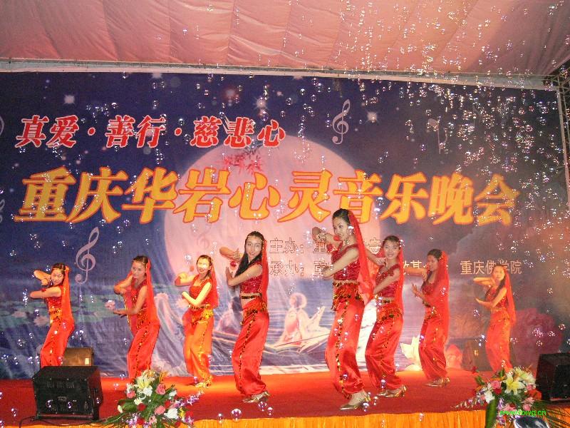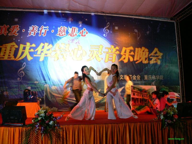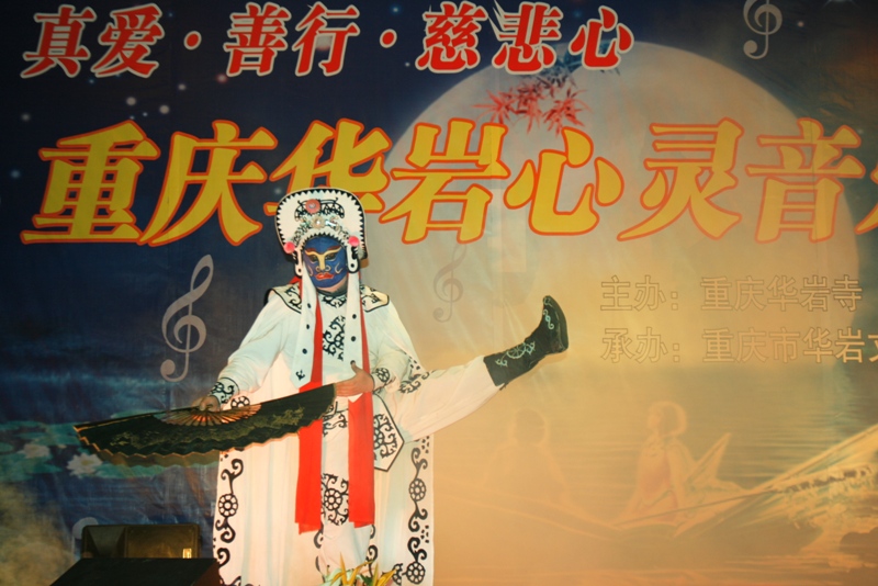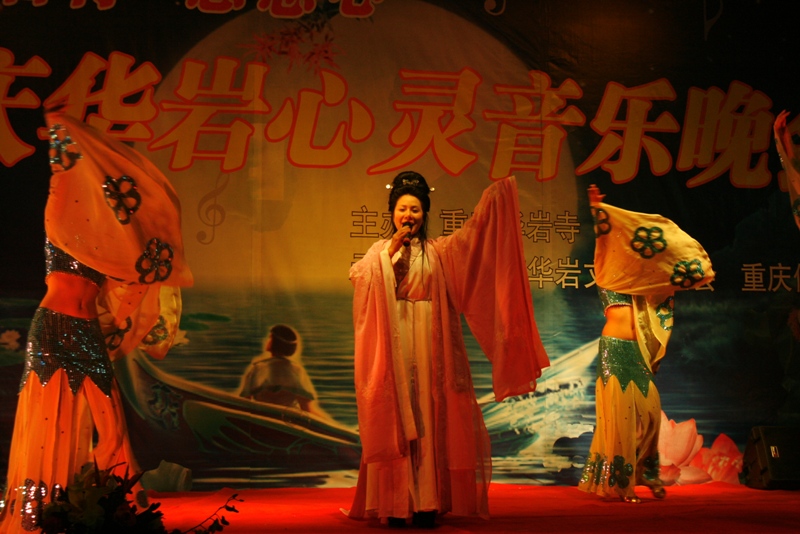 重庆华岩心灵音乐晚会在重庆佛学院学僧唱诵赞呗《三宝赞》中拉开序幕,有上海居士李义红带来的<甜蜜蜜>、重庆佛学院男众心印师的东北大鼓《六祖慧能》、重庆佛学院女众学僧带来的小品《重在教育》、重庆佛学院女众学僧藏文师的 梵歌《心经》、重庆佛学院男众学僧的小品《风雨中的热粥》、 陈青居士独唱的《观世音菩萨》、重庆华岩寺方丈道坚法师演唱的《楞言一笑》将晚会推向了高潮,大多数现场观众都是首次看见法师上台演唱。重庆华岩寺文教基金会资助的重庆师大聋人大学生美妙的民族舞蹈《亚利亚》、盲童王一木架子鼓演奏、重庆慧灵智障人士援助中心学员的 音乐剧《大爱》让人们体会到我们所居住的这个娑婆世界的美好和洁净。重庆华岩寺文教基金会西南政法大学灾区支教队的 朗诵《聆听大山的呼唤》、北川陈家坝中学学生羌歌羌舞展现了重庆华岩文教基金会慈度众生的慈悲喜舍精神和灾后人们自强不息,重建家园的信心。