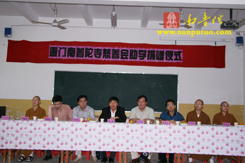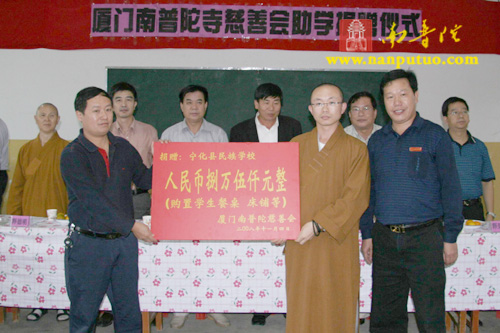 厦门市民宗局对南普陀寺慈善会的工作一直非常关心和支持,此次民宗局陈建德书记等几位领导,专程与我会几位法师来到受助学校参加捐赠活动。捐赠仪式上,宁化县委常委、统战部何正彬部长对我会的善举给予高度评价,果妙法师代表南普陀寺慈善会对于该校购置的床及餐桌表示非常满意,并鼓励学生好好学习,健康成长。
