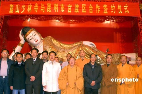 少林寺与云南昆明市官渡区政府二十四日在少林寺藏经阁签订协议,少林寺正式接管昆明市官渡区官渡古镇内的土主寺、法定寺、妙湛寺、观音寺四所古寺为少林寺下院。双方约定,少林寺首批将派遣十多名僧人进驻四所古刹,按少林寺的治寺理念和管理模式进行管理。少林寺方丈释永信与昆明市官渡区区长刘跃进分别代表双方签字。