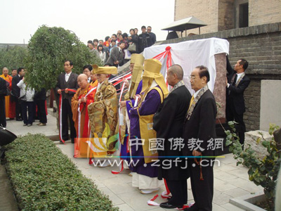 在日本净土宗宗务总长稻康 觉顺带领下的一百余人首先与中方僧众在大殿诵经祈福,并宣读报恩文疏,中国佛教协会传印老和尚代表中国佛教协会拈香主法,香积寺住持本昌法师、陕西省佛协副会长谛性法师、终南山佛教协会会长宽旭法师、副会长宽池法师、定慧法师、宽印法师参加祈福报恩法会。随后,在香积寺善导大师供养塔前举行报恩碑揭碑仪式,陕西省宗教局、西安市宗教局、长安区宗教局相关领导参加揭碑仪式。