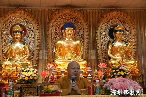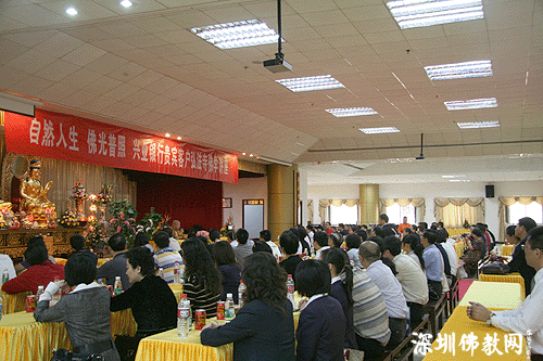 秋日的阳光,分外灿烂。深圳弘法寺迎来一批批香客。但今天(2008年11月15日)更是不同平常,弘法寺经堂悬挂着“自然人生,佛光普照,兴业银行贵宾客户弘法寺佛学讲座”的会标。上午九时,印顺大和尚带领兴业银行贵宾客户一百多人,兴致勃勃地走进经堂,问询后,大家井然入座。印顺法师契机为大家说法。