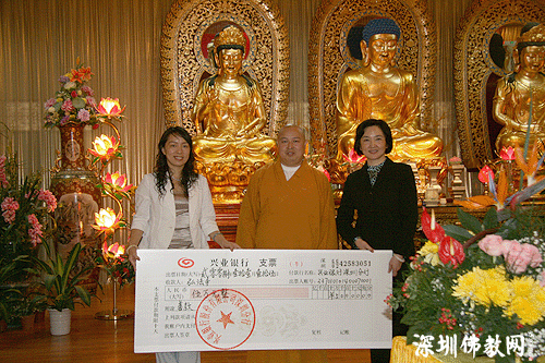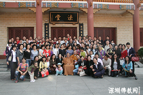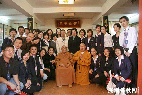 与会者仪态端庄,声形肃静,沐浴在佛光之中。感恩之心由然生起。兴业银行深圳分行零售部两位副总裁张鹏风、万育全代表该行向弘法寺捐善款5万元,以此善举表达对慈善事业的关心。随后,这一百多人依次来到弘法寺东方丈室拜见当代佛门泰斗本焕长老。本老和印顺大和尚与大家在法堂前合影。留下珍贵之纪念。