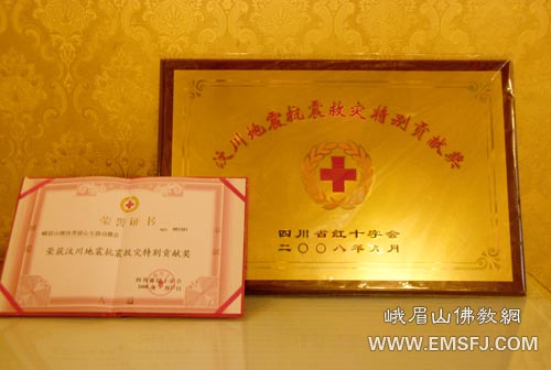 汶川5.12地震以来,峨眉山佛教协会本着“无缘大慈,同体大悲”的菩萨道精神,组织全山寺院的法师和居士多次向受灾地区捐款捐物,并举行各种祈福追荐法会,为灾区人民消灾祈福。为此,四川省红十字会特向峨眉山佛教协会颁发“汶川地震抗震救灾特别贡献奖”牌匾及荣誉证书,以表彰峨眉山佛教协会在抗震救灾中所作的贡献。