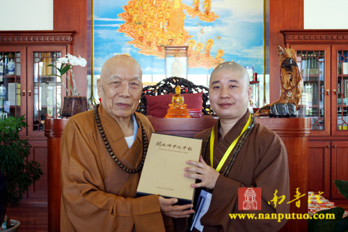 上午8时,参访团一行乘车前往风景区日月潭游览。位于日月潭中心的玄奘寺住持传济法师与参访团成员进行了友好交流,双方都表示有缘相遇,真是法缘殊胜。中午11时15分参访团前往埔里中道学苑拜访真华长老,长老今年高寿八十八,是印顺导师的学生,极为平易近人,其间还亲切地谈起早年的行脚生活,也谈起导师当年在闽院的时光,会谈之后,长老盛情设宴招待大家。